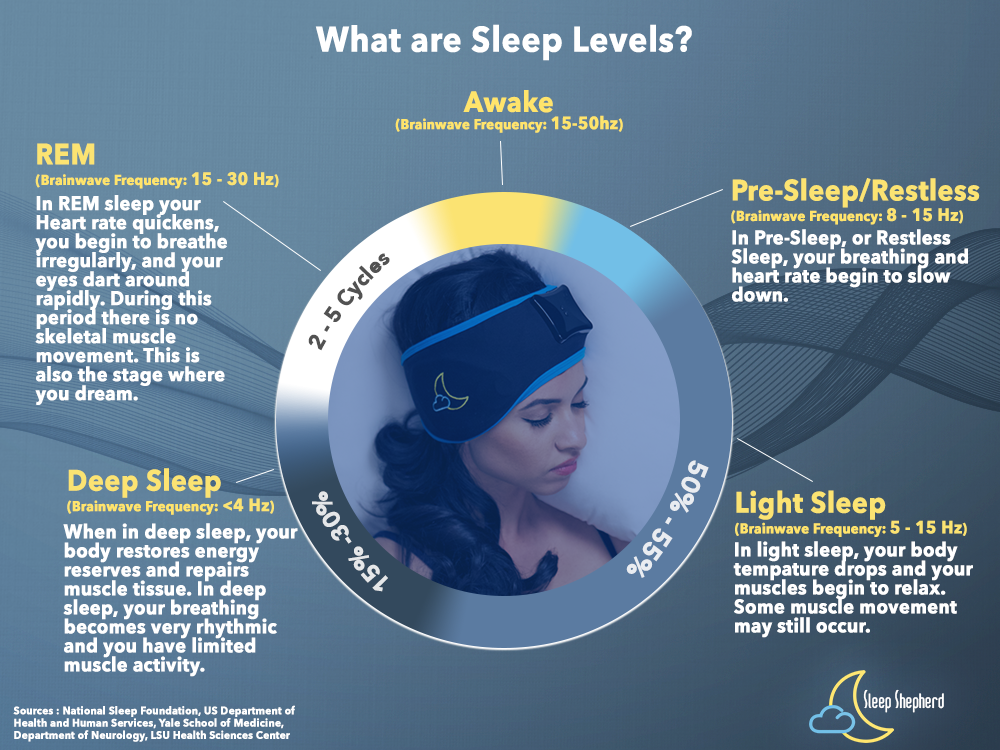 One of the primary challenges of this system is determining if the user is truly awake or just in a REM phase. As you can see from the infographic below, REM brainwave frequencies will often closely mimic that of an awake state. However, during a REM period, there is limited skeletal muscle movement. For this reason, the device will often avoid playing tones during REM by requiring instances of increased brainwave frequency to be coupled with a detection of motion prior to administering tones.